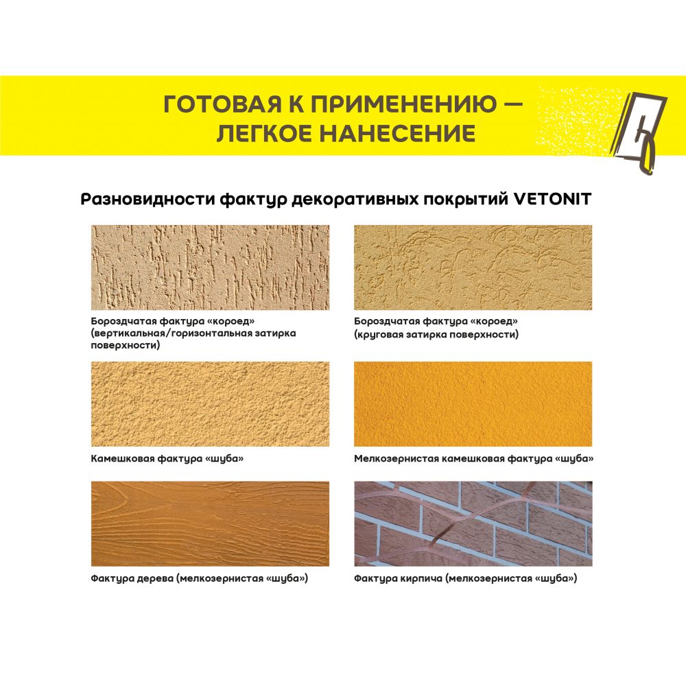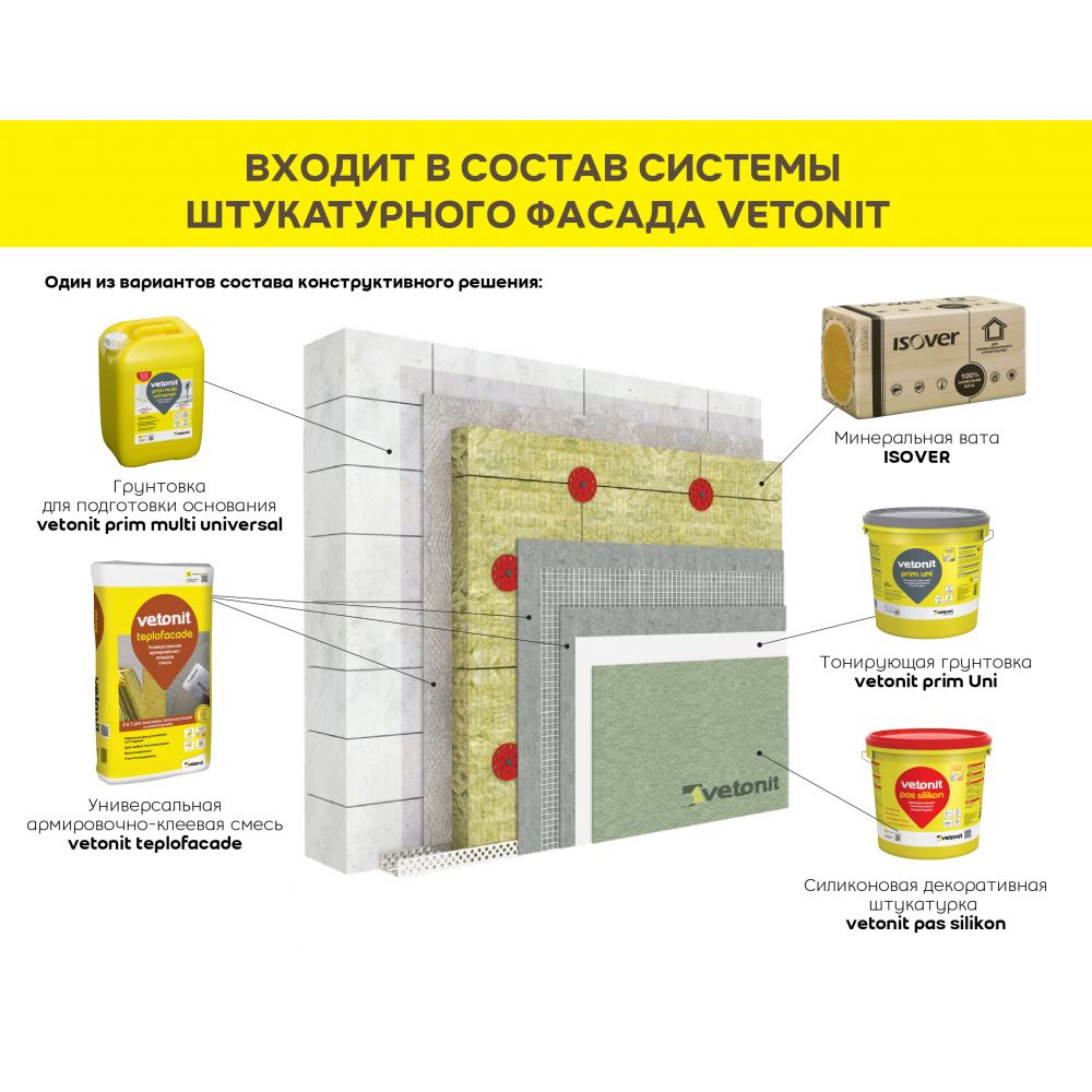 Силиконовая декоративная штукатурка. Подходит для создания декоративно-защитного финишного слоя на поверхности систем Штукатурного фасада (СФТК) Vetonit с минеральной ватой (базальтовой и кварцевой), а также пенополистиролом. Представлена в фактурах шуба и короед с размером зерна от 1,5 до 2 мм. Устойчива к воздействию щелочей и выхлопных газов, стойка к воздействию ультрафиолета, подходит для работ при сложных погодных условиях, а также обладает эффектом самоочищения. Морозостойкость материала 100 циклов. Не требует последующей окраски, так как колеруется в массе в соответствии в соответствии с цветовой палитрой Vetonit Color Spectrum, RAL, NCS и другими системами.