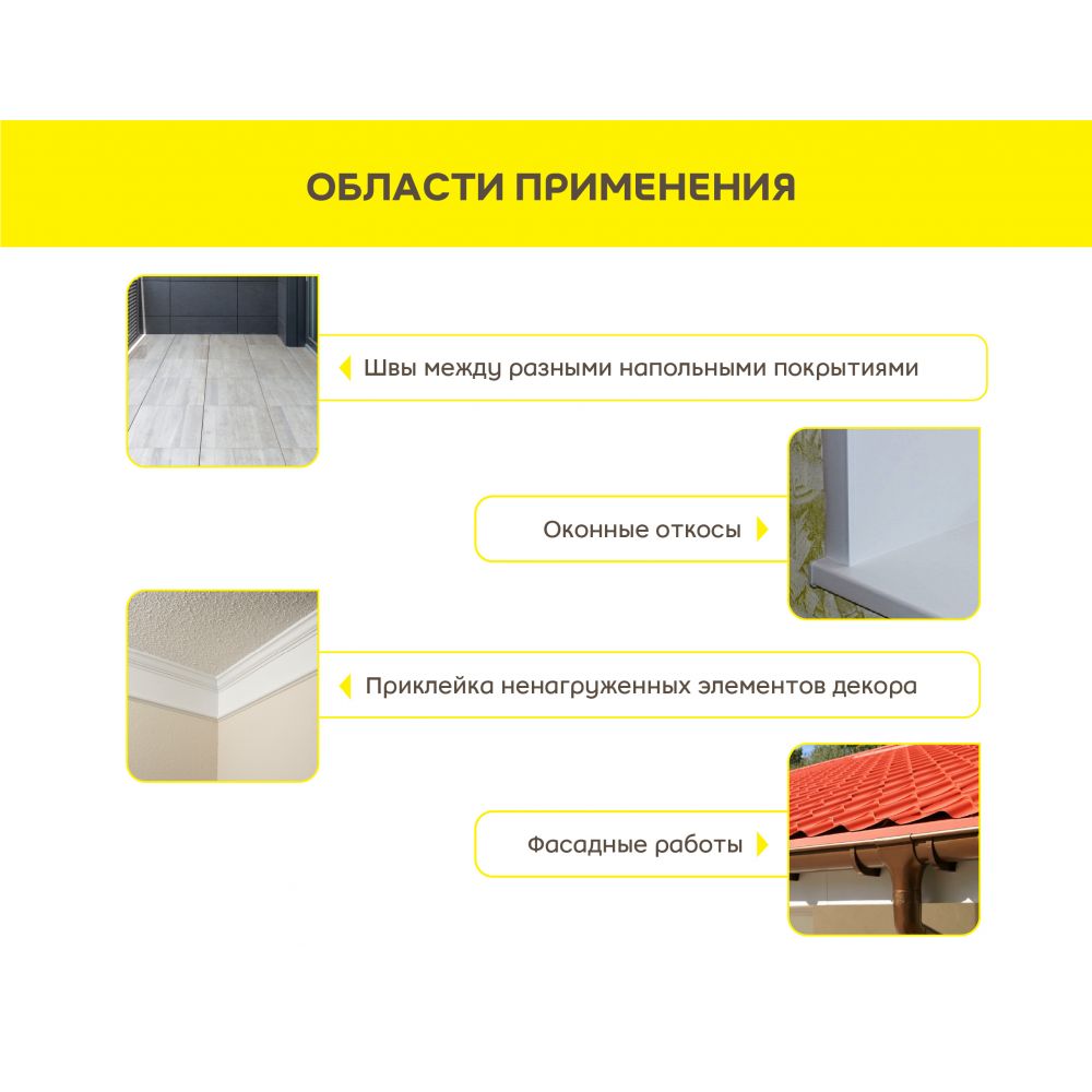 Герметизация швов между разными напольными покрытиями (напр. паркетом, ламинатом, плиткой, керамогранитом, стеклом, пвх, линолеумом). Герметизация оконных откосов изнутри и снаружи зданий, подоконников. Приклейка ненагруженных элементов декора, не требующих быстрого склеивания (Потолочный плинтус, лепнина, деревянные элементы, пластик, дверные пороги, лестничные ступени, бортики, досчатая обшивка, сборные элементы). Фасадные работы (заполнение швов и трещин >5 мм, герметизация примыканий фасада к цоколю, дверям окнам, отливам, козырькам, капельникам).