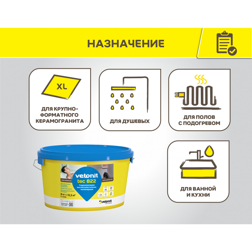 Высокоэластичная бесшовная полимерная гидроизоляция под плитку для помещений с повышенной влажностью — ванных комнат, душевых, санузлов, кухонь, балконов и лоджий Для защиты от повреждения водой чувствительных к влаге материалов: гипсокартонных листов, гипсоволокнистых листов, гипсовых штукатурок и полов. Подходящие основания: бетонные и цементные полы, цементные и