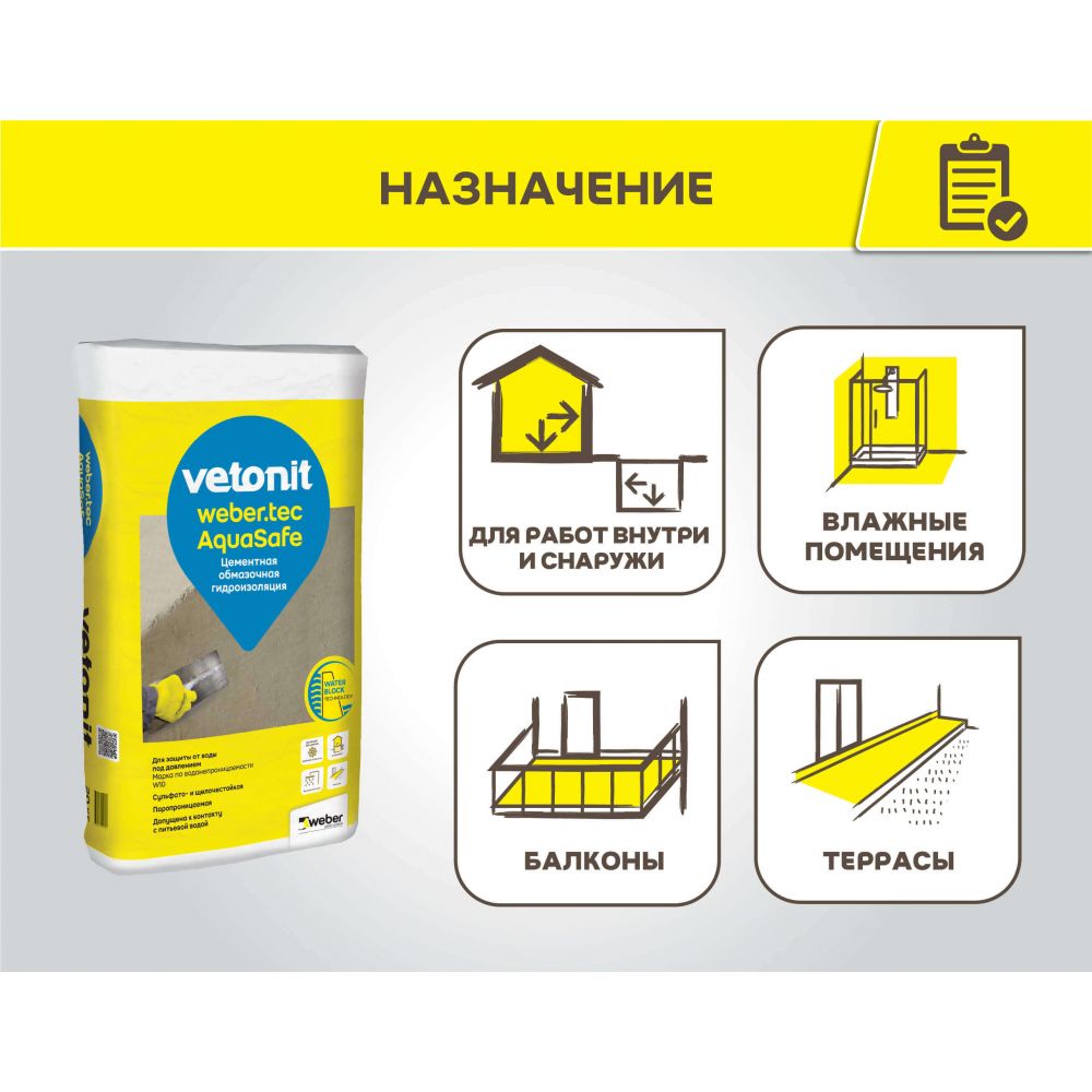 Цементная жесткая обмазочная гидроизоляция для защиты строительных конструкций от воды, в том числе под давлением, для гидроизоляции фундаментов, стен подвалов, гидротехнических сооружений (в том числе с питьевой водой), террас, балконов, ступеней, бассейнов, стен и полов (внутри и снаружи) под последующую облицовку плиткой, в мокрых и влажных помещениях (например, ванные комнаты, кухни, сан.узлы, прачечные и др.).