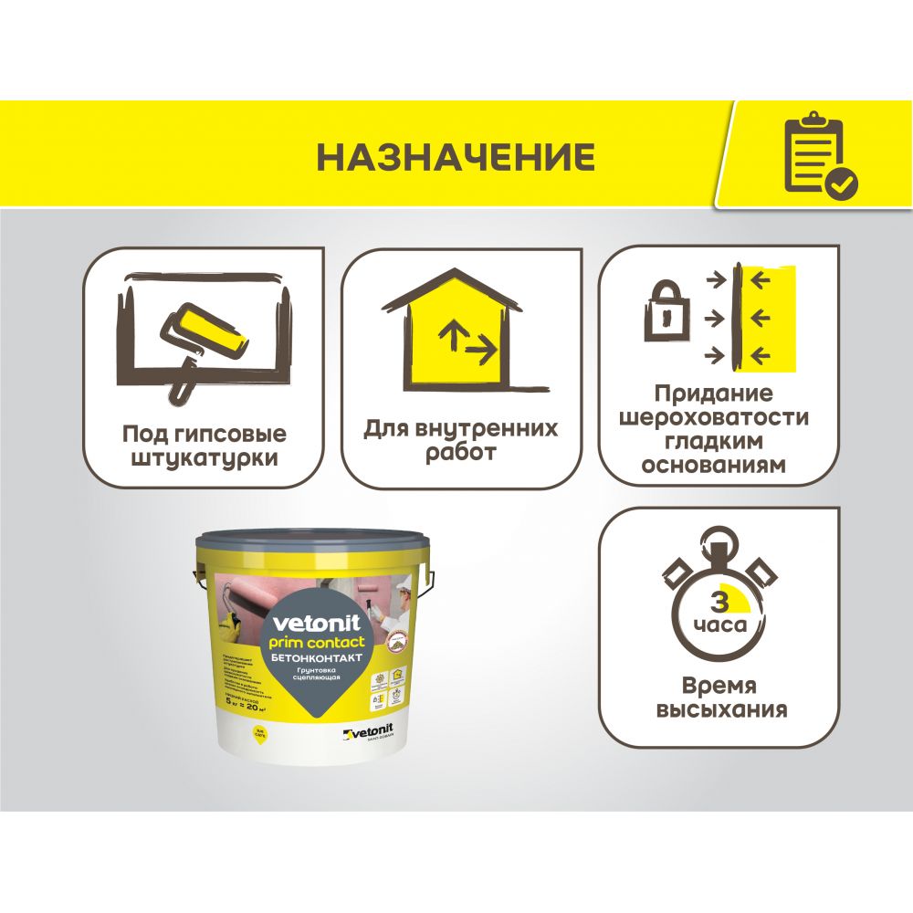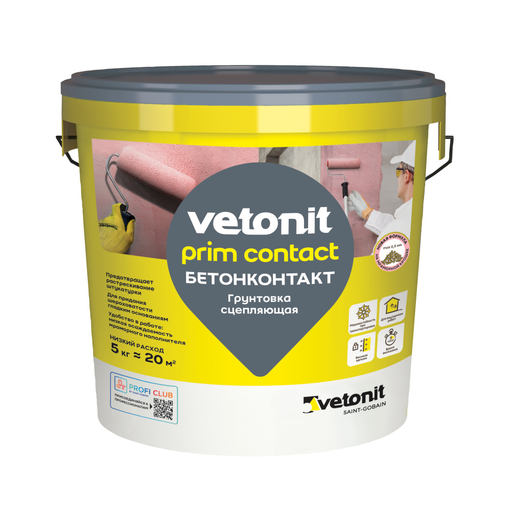 Prim contact — сцепляющая грунтовка с мраморной крошкой для качественной подготовки стен и потолков, предания шероховатости гладким основаниям и последующего оштукатуривание гипсовыми материалами. Улучшает сцепление с основой, имеет индикатор цвета. Для внутренних работ, готов к применению. Новая формула разработана так, что работать с грунтовкой еще удобнее работать благодаря специально подобранной фракции.