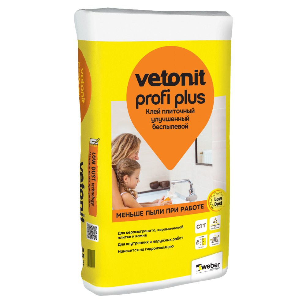 Vetonit Profi Plus — клей класса С1 Т. Уникальная беспылевая формула позволяет сделать ремонт чище, не запачкав финишную отделку соседних зон. Меньше пыли — больше комфорта для работы мастера. Подходит для внутренних и наружных работ. Для стен и пола, включая систему «Теплый пол». Рекомендованный формат керамогранита до 60×60 см. Совместим с гидроизоляцией, надёжен в эксплуатации влажных помещений.