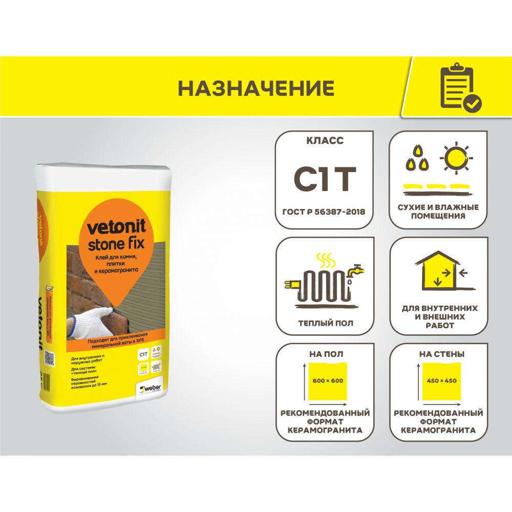 Vetonit Stone Fix — клей класса С1 Т. Подходит для внутренних и наружных работ. Для стен и пола, включая систему «Теплый пол». Рекомендованный формат керамогранита до 45×45 см на стены и до 60×60 см на пол. Отлично фиксирует кладку из декоративного и натурального камня! Совместим с гидроизоляцией, надёжен в эксплуатации влажных помещениях, а также на балконах, лоджиях, террасах.
