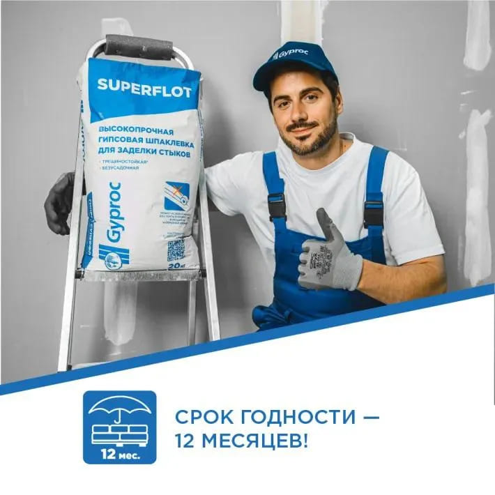 Gyproc SUPERFLOT (Гипрок СУПЕРФЛОТ) — высокопрочная безусадочная трещиностойкая гипсовая шпаклевка для стыков ГСП на основе высококачественного гипсового вяжущего с полимерными добавками. Самая прочная гипсовая шпаклевка для стыков ГСП в России!