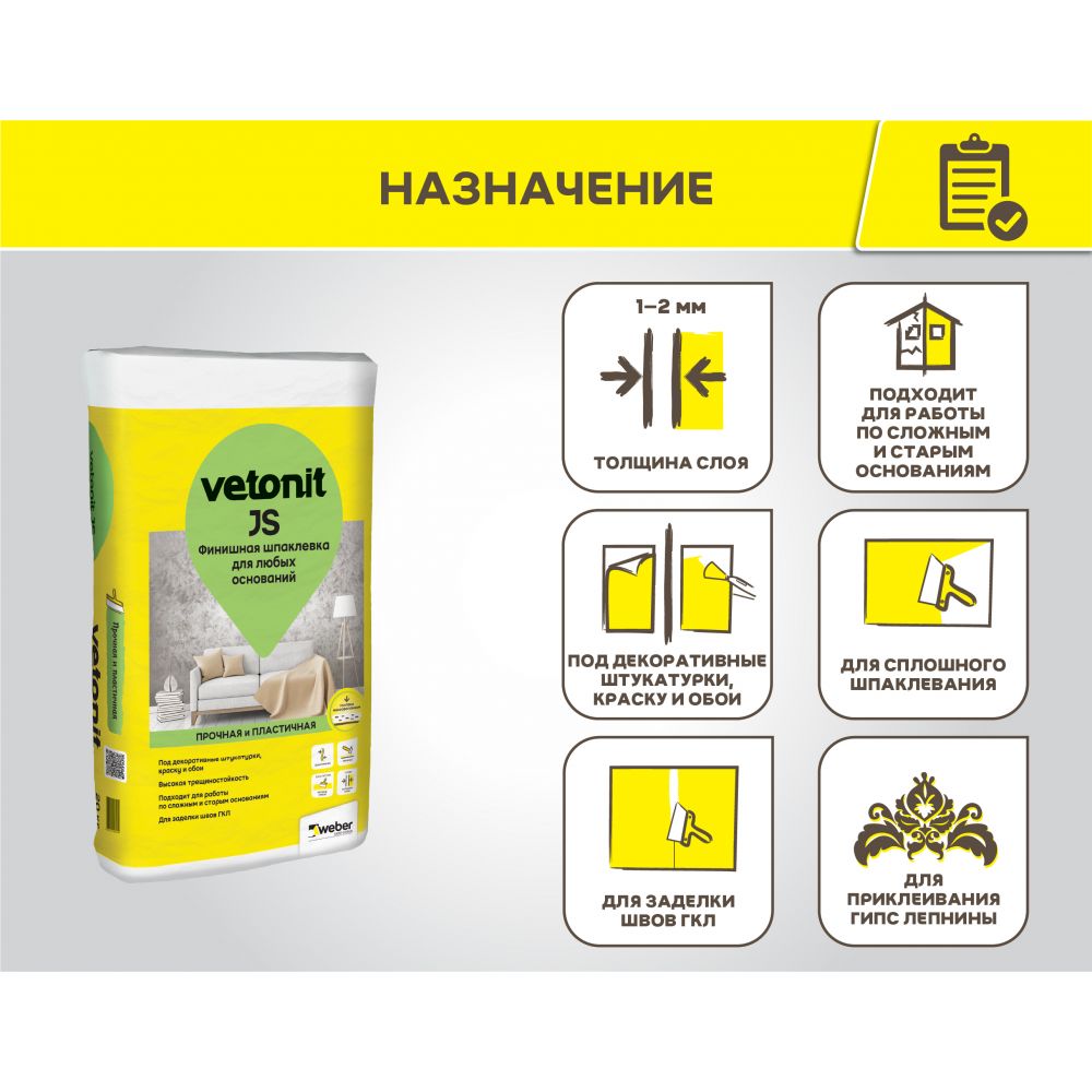Vetonit JS — финишная шпаклевка белого цвета на полимерном связующем. Прочная и пластичная! Предназначена как для сплошного шпаклевания, так и для специализированного использования: под декоративные штукатурки, для заделки швов ГКЛ, для работы по сложным основаниям, для приклейки гипсовой лепнины. В составе имеется микроволокно, которое делает финишную поверхность особенно прочной. Для внутренних работ в сухих помещениях. Качество поверхности после шлифовки не ниже К3 согласно СП 71.1330 2017.