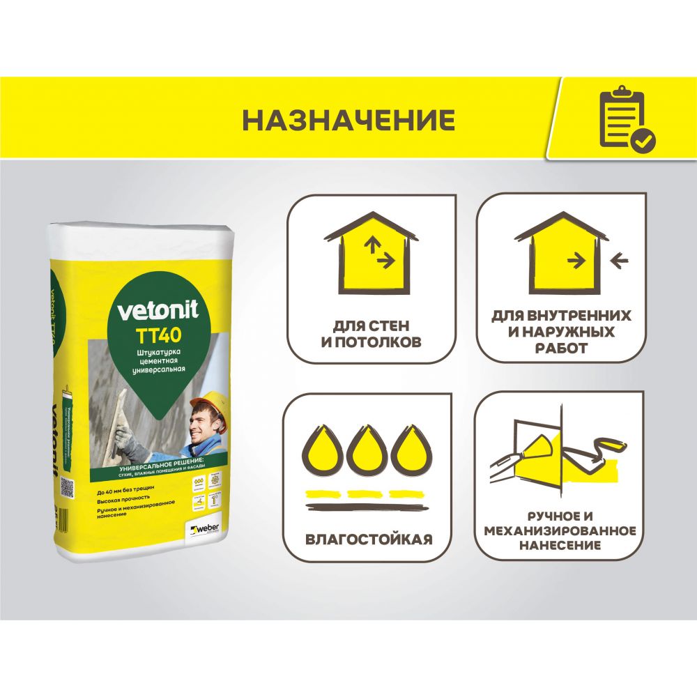 Vetonit TT40 — универсальная цементная штукатурка. Подходит для оштукатуривания фасадов, для предварительного выравнивания и ремонта стен и потолков в сухих, влажных и мокрых помещениях перед дальнейшим шпаклеванием, перед облицовкой керамической плиткой. Применяется по основаниям из бетона, кирпича, керамзитобетонных блоков, цементных штукатурок. Обладает повышенной влагостойкостью, высокой прочностью, трещиностойкостью, морозостойкостью. Для внутренних и наружных работ. Наносится ручным и машинным способом.
